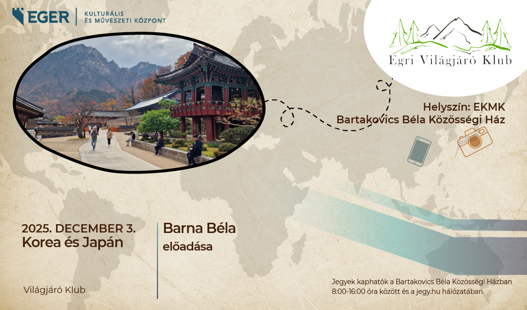 EGRI VILÁGJÁRÓ KLUB: KOREA ÉS JAPÁN Egri Kulturális és Művészeti Központ, EKMK- Bartakovics Béla Közösségi Ház 3300 Eger, Knézich Károly út 8.